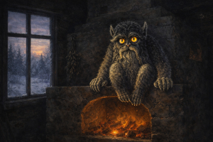 В его избе сбоку лесной опушки,